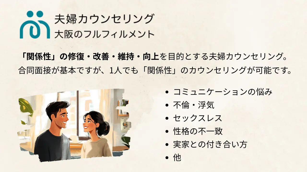 夫婦カウンセリングの新規ホームページ公開しました 2017.07.132023.01.24 執筆者:山崎 孝公認心理師・ブリーフセラピスト・家族相談士 夫婦・カップルのカウンセリングの情報が増えてきたので新規ホームページに独立させることにしました。 夫婦・カップルのカウンセリング 大阪のフルフィルメント夫婦・カップルの悩み(不倫・浮気、セックスレス、コミュニケーション、性格不一致、他)の改善や関係の回復をサポートする大阪のカウンセリングルーム。対面とオンライン。 今後、夫婦・カップルカウンセリングに関わる情報は、新規ホームページに集約していきます。よろしくお願いいたします。